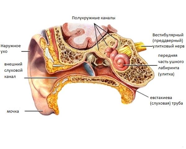 Ухо состоит из внешнего, среднего и внутреннего. Барабанная перепонка и три крошечные кости проводят звук из барабанной перепонки к передней части ушного лабиринта. Внутреннее ухо — один из трёх отделов органа слуха и равновесия. Является наиболее сложным отделом органов слуха, из-за своей замысловатой формы называется лабиринтом.