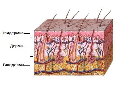 Кожа человека состоит из эпидермиса (самый наружный слой), дермы (слой, придающий коже прочность и эластичность), гиподермы (подкожно-жировая клетчатка для хранения питательных веществ и терморегуляции).