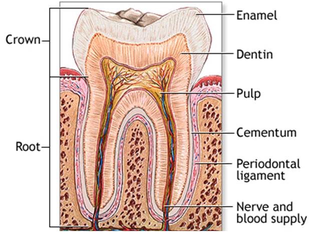 The structure of the tooth includes dentin, pulp and other tissues, blood vessels and nerves imbedded in the bony jaw. Above the gum line, the tooth is protected by the hard enamel covering.