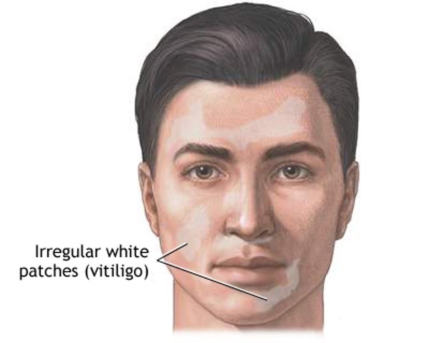 Vitiligo is a skin condition in which there is a loss of color (pigment) from areas of skin. This results in uneven white patches that have no pigment, but the skin feels like normal.
