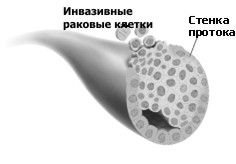 На этой иллюстрации изображено распространение раковых клеток за пределы протока. Раковые клетки проникают в прилежащую ткань внутри молочной железы.