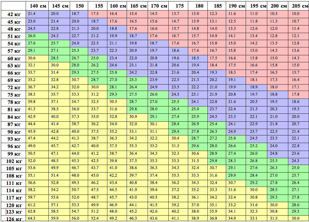 Отметьте свой вес в левой части таблицы и рост – в верхней части. Проведите горизонтальную линию от веса и вертикальную линию от роста: цифра в месте соединения этих линий и есть ваш росто-весовой индекс (РВИ). РВИ от 19 до 24,9 соответствует нормальным показателям; РВИ от 25 до 29,9 отражает избыток массы тела; РВИ свыше 30 говорит о том, что вы страдаете ожирением.
