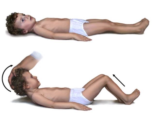 Менингиттің көрнекі симптомдарының бірі - Брудзинский симптомы. Мойын бұлшық етінің айқындалған сіресуінен басты төмен еңкейткенде тізе және жамбас буындары бүгіледі.