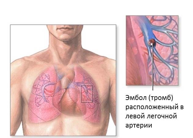 Легочная эмболия чаще всего вызвана закупоркой вены тромбом. Наиболее распространенной локализацией тромбов являются глубокие вены бедра или области таза. Это называется тромбозом глубоких вен (ТГВ). Часть такого тромба может оторваться и по кровотоку попасть в легкие.