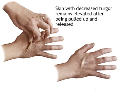 Poor skin turgor -- the skin may not be as elastic as normal and sag back into position slowly when the health care provider pinches it up into a fold (normally, skin springs right back into place)