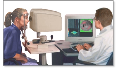 Осмотр глаз с помощью щелевой лампы (аппарат, позволяющий производить микроскопический анализ видимых частей глаза - век, склеры, конъюнктивы, радужки, хрусталика и роговицы)