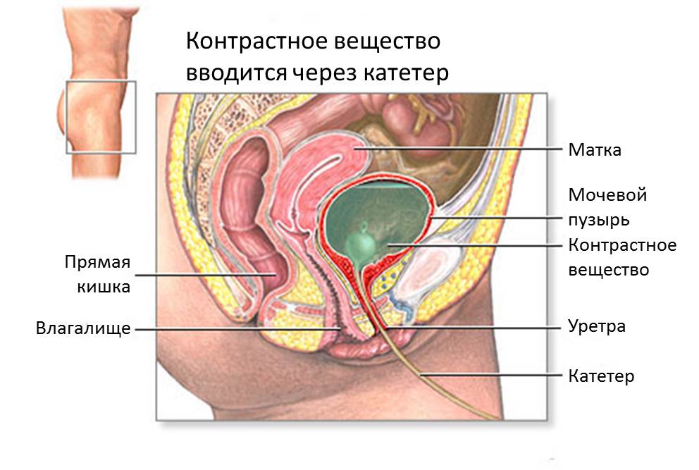Для определения функции мочевого пузыря применяется рентгенологическое исследование, во время которого через катетер (трубку) мочевой пузырь заполняют контрастным веществом. Рентгенологические снимки делают во время полного мочевого пузыря и во время опорожнения мочевого пузыря для того, чтобы определить, в каком количестве выделяется жидкость через уретру и/или через мочеточники из почек (пузырно- мочеточниковый рефлюкс). Данный метод исследования проводится в положении лежа на столе.