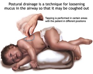 · Выведение слизи или мокроты из дыхательных путей. Это должно проводиться 1-4 раза в день. Для поддержания чистоты дыхательных путей пациенты, члены семьи и воспитатели должны овладеть техникой перкуссии грудной клетки и постурального дренажа.