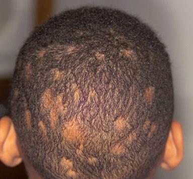 На коже головы под волосами образуются округлые красные пятна, где все волосы обламываются над уровнем кожи, кажутся состриженными на одном уровне. Появляются залысины.