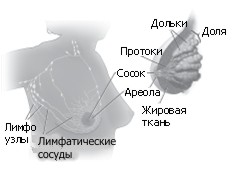На рисунке представлено анатомическое строение здоровой молочной железы.